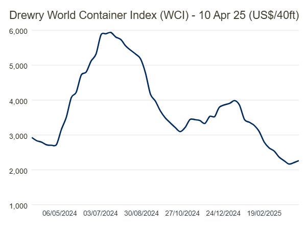 Drewry WCI bileşik endeksi, Eylül 2021'deki 10.377 dolarlık önceki pandemi zirvesinin %78 altında kalarak %3 artarak 40 ft konteyner başına 2.265 dolara çıktı. Ancak endeks, 2019'daki (pandemi öncesi) ortalama 1.420 dolardan %59 daha yüksekti.