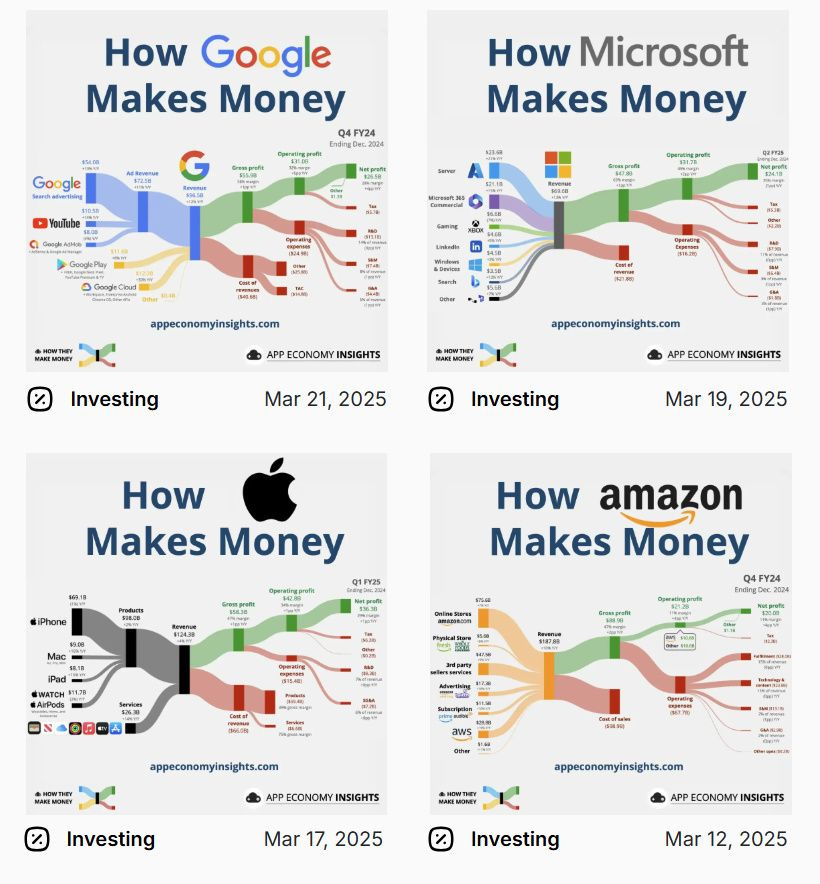 Google, Microsoft, Apple ve Amazon gibi dünyanın en büyük teknoloji şirketleri parayı tam olarak nereden kazanıyor? Bu grafikler, her bir şirketin gelir kaynaklarını, operasyonel kârlarını ve maliyet yapılarını sade ve çarpıcı bir şekilde gözler önüne seriyor.