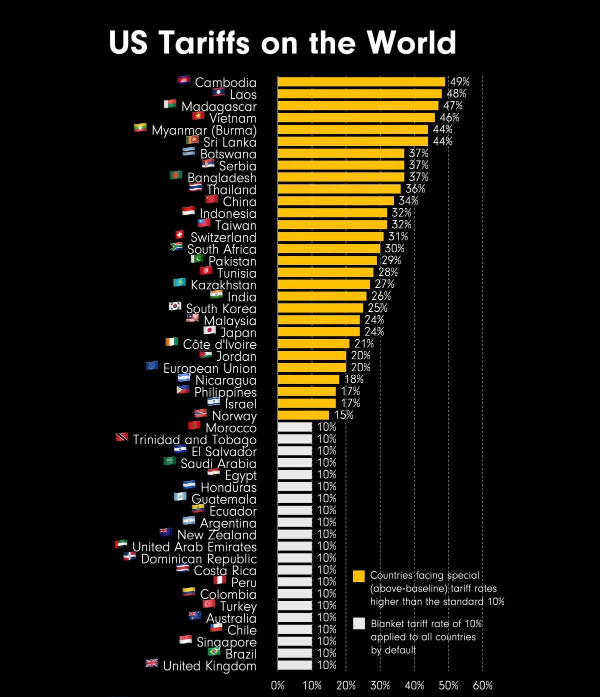 ABD, bazı ülkelere standart %10’un çok üzerinde, %49’a kadar çıkan özel gümrük tarifeleri uyguluyor. Kamboçya, Laos ve Vietnam gibi ülkeler en yüksek tarifelere maruz kalırken; Türkiye, Avrupa ülkeleriyle birlikte %10’luk temel tarife diliminde yer alıyor.