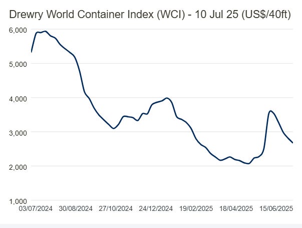 Bu düşüş, ABD’ye yönelik yük talebinin düşük olmasının doğrudan bir sonucu ve yakın zamanda, yüksek ABD tarifelerinin geçici olarak durdurulmasının ardından yaşanan ithalat artışının, ilk başta beklediğimiz kadar kalıcı bir etki yaratmayacağının bir göstergesi.