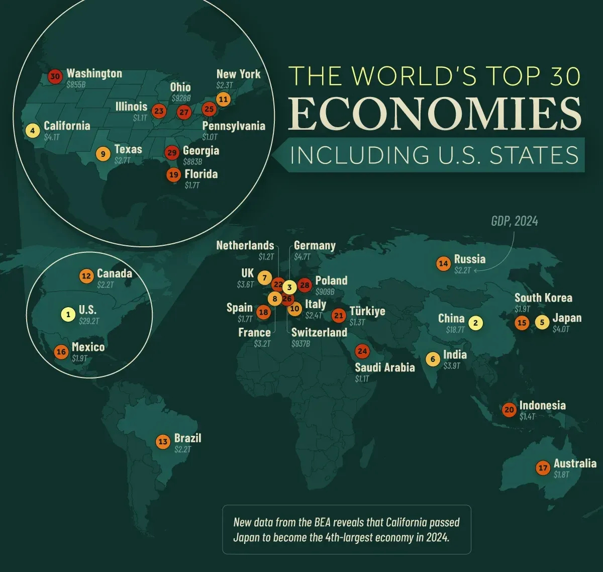 Kaliforniya, 2024’te Japonya’yı geride bırakarak 4,1 trilyon dolarlık GSYİH ile dünyanın en büyük 4. ekonomisi oldu. Toplam dokuz ABD eyaleti, dünya genelindeki en büyük 30 ekonomi arasında yer aldı.