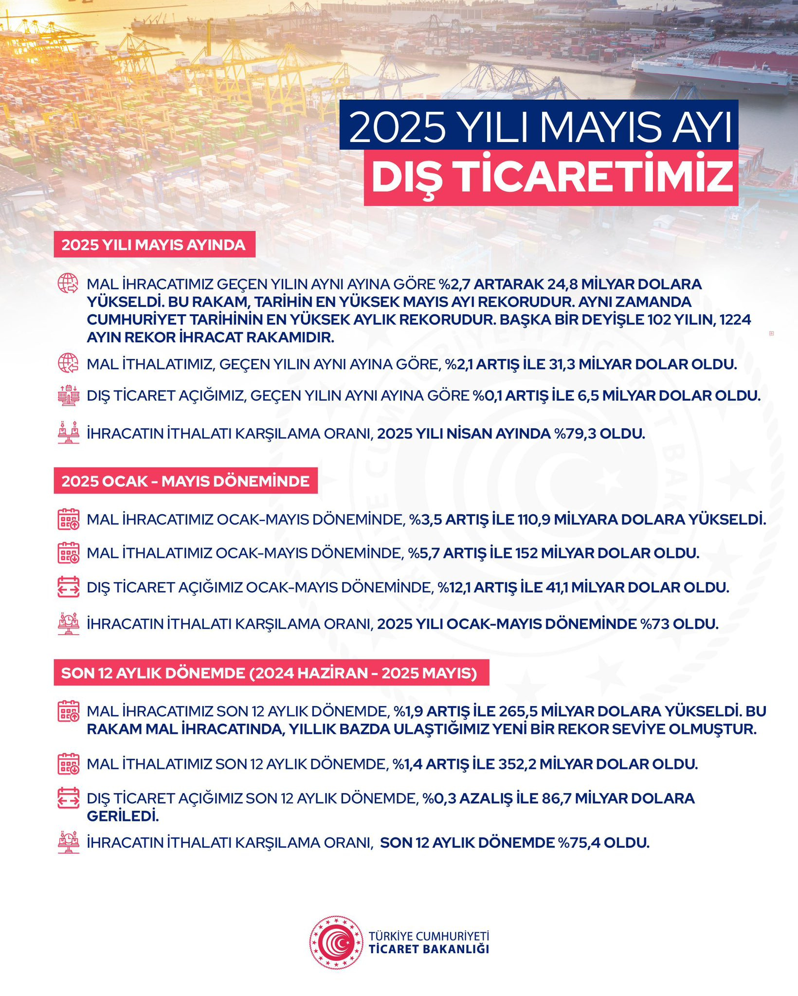 Ticaret Bakanlığı'nın verilerine göre, 2025 yılı Mayıs ayında ihracat %2,7 artarak 24 milyar 834 milyon dolara, ithalat ise %2,1 artışla 31 milyar 304 milyon dolara ulaştı. Aynı dönemde dış ticaret hacmi %2,4 artışla 56 milyar 138 milyon dolar olarak gerçekleşti.