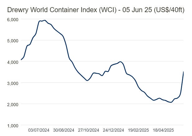 Drewry'nin WCI endeksi son 4 haftada %70 artış gösterdi. Bu artış, Başkan Donald Trump’ın ithalat vergilerine getirdiği “ara” sayesinde, transpasifik taşımacılıktaki ilk çöküşün ardından ABD’ye yönelik trafiğin yeniden başlamasından kaynaklanıyor.