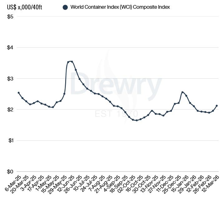 Drewry Dünya Konteyner Endeksi (WCI), bu hafta %8 artışla 40ft konteyner başına 2.123 $ seviyesine ulaştı. Artış, özellikle Asya–Avrupa hattında ve Transpasifik rotasında yükselen navlun fiyatlarından kaynaklandı.