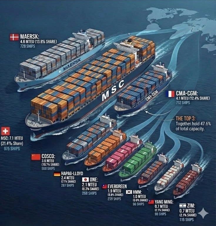 2026 yılı itibarıyla küresel konteyner taşımacılığı kapasitesi büyük ölçüde başlıca 10 taşıyıcı tarafından yönetilmektedir. Lider konum MSC’ye ait olup, onu Maersk, CMA-CGM ve COSCO takip etmektedir. Bu firmalar toplam kapasitenin yaklaşık %84’ünü oluşturmaktadır.