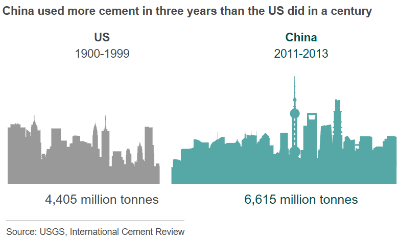 Bu görsel, Çin'in 2011-2013 yılları arasında kullandığı çimento miktarının, ABD'nin 1900-1999 yılları arasındaki toplam çimento tüketiminden daha fazla olduğunu gösteriyor.
