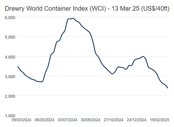 Bu, Eylül 2021'deki pandemi zirvesi olan 10.377 doların %77 altında ve Ocak 2024'ten bu yana en düşük seviyede. Ancak endeks, pandemi öncesi 2019'daki ortalama 1.420 dolardan %67 daha yüksek kaldı.