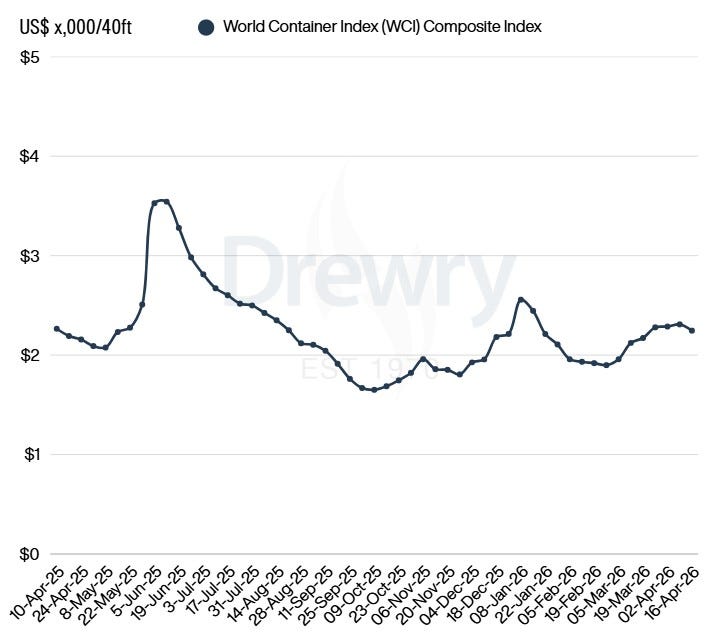 Drewry Dünya Konteyner Endeksi (WCI), Orta Doğu’daki jeopolitik gerilimler ve artan yakıt fiyatlarının etkisiyle yaşanan 6 haftalık yükselişin ardından %3 düşerek 2.246 dolar seviyesine geriledi. Özellikle Şanghay–New York ve Los Angeles ile Asya–Avrupa hatlarında spot navlun fiyatlarında düşüş gözlendi. Taşıyıcılar, Transpasifik hattında planlanan boş seferlerle (blank sailing) kapasiteyi dengelemeye çalışırken, 1 Mayıs itibarıyla devreye girmesi beklenen Peak Season Surcharge (PSS) ve yeni yakıt ek ücretleri piyasayı etkilemeye hazırlanıyor.