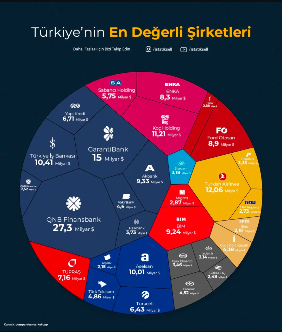 Bu grafik, Türkiye'deki en değerli şirketleri piyasa değerine (market cap) göre sıralayan görsel bir infografik. Her şirketin piyasa değerini milyar dolar cinsinden gösterirken aynı zamanda sektörlere göre renk kodlaması yaparak daha kolay okunabilir hale getiriyor.