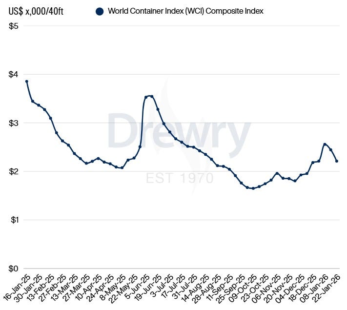 Drewry Dünya Konteyner Endeksi (WCI), 22 Ocak 2026 haftasında %10 düşüşle 2.212 $/40 ft seviyesine gerileyerek ikinci haftadır düşüş kaydetti.