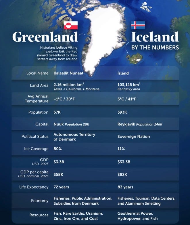 Greenland, yüzölçümü olarak Iceland’dan 20 kat daha büyük olmasına rağmen nüfusu çok daha küçük. Iceland ise daha ılıman iklime, çok daha yüksek bir GSYH’ye, uzun yaşam süresine ve çeşitli bir ekonomiye sahip. İsimleri sıkça karıştırılsa da iki ada; coğrafya, iklim, nüfus, ekonomi ve siyasi statü açısından belirgin şekilde ayrışıyor.