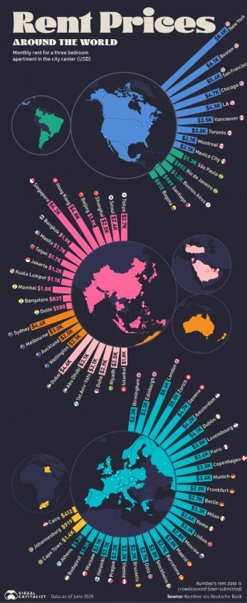 2025’te şehir merkezinde 3+1 daire kiralarının en pahalı olduğu şehir New York oldu; aylık ortalama kira 8.388 dolar seviyesinde. En yüksek kiralar ağırlıklı olarak Kuzey Amerika ve Batı Avrupa şehirlerinde yoğunlaşıyor. ABD şehirleri (New York, Boston, San Francisco, Los Angeles) üst sıralarda yer alırken; Londra, Zürih, Cenevre, Amsterdam gibi Avrupa merkezleri de yüksek kira seviyelerini koruyor. Buna karşılık Latin Amerika, Güney Asya ve Afrika şehirleri çok daha uygun kiralar sunuyor. Küresel ölçekte konut maliyetleri, birçok şehirde ücret artışlarının üzerinde seyrederek hanehalkları üzerinde baskı oluşturmaya devam ediyor.