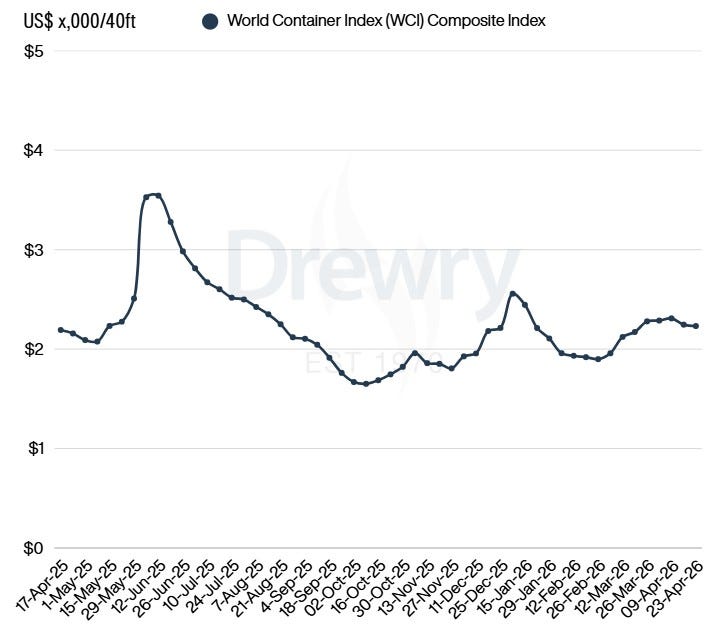 Spot navlun fiyatları, piyasa baskısının sürmesiyle gerilemeye devam etti. Drewry Dünya Konteyner Endeksi (WCI), ikinci haftada da düşerek %1 azalışla 40’lık konteyner başına 2.232 dolara indi. Özellikle Asya–Avrupa hattındaki düşüş öne çıkarken, artan maliyetlere rağmen zayıf talep fiyat artışlarını sınırlıyor.