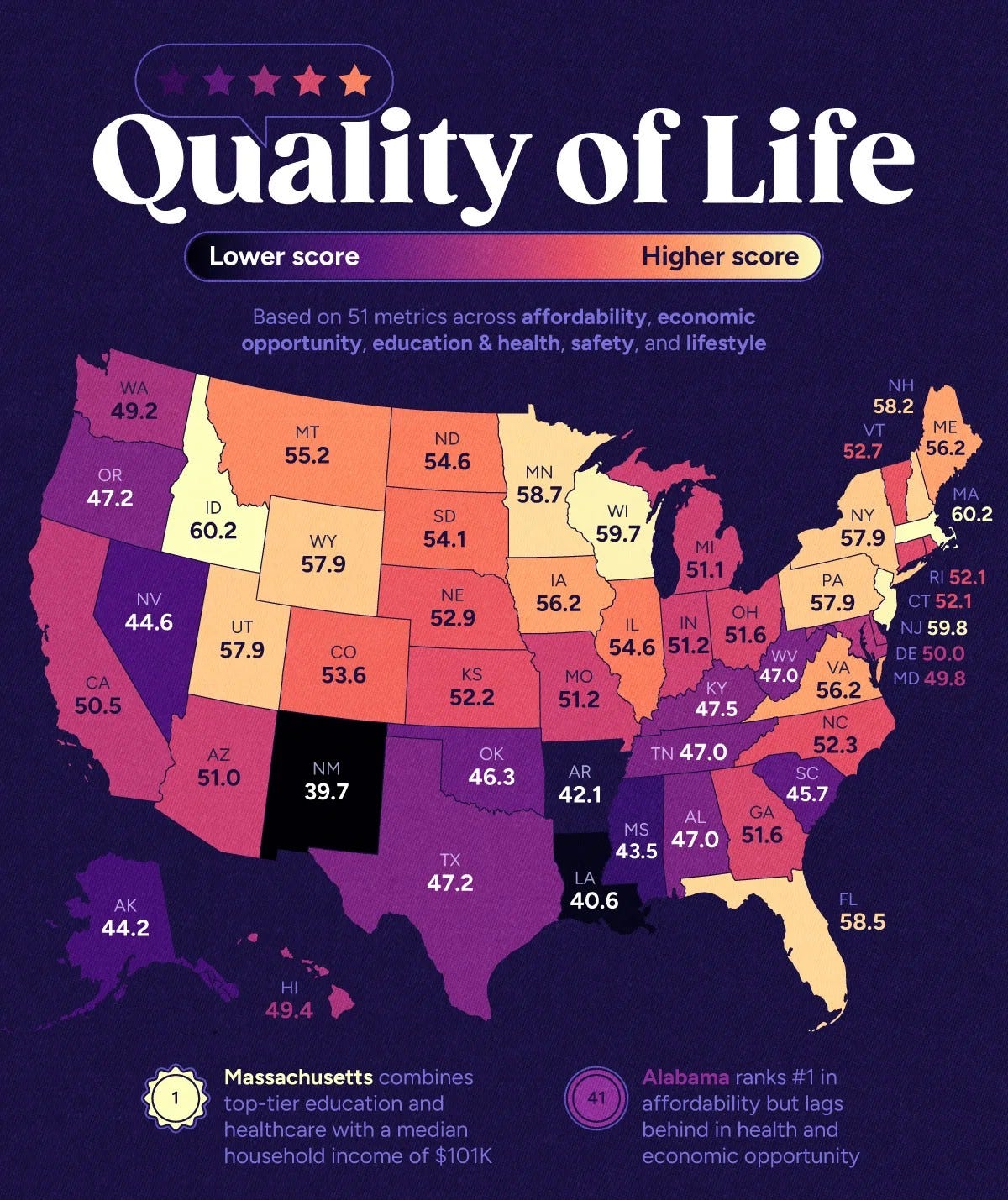 2025 verilerine göre ABD’de yaşam kalitesi en yüksek eyalet Massachusetts olurken Orta Batı eyaletleri özellikle Idaho ve Wisconsin güçlü performanslarıyla öne çıkmaktadır; düşük maliyetli eyaletler New Mexico ve Louisiana ise sağlık ve güvenlik alanlarındaki eksiklikler nedeniyle alt sıralarda yer almakta olup bu durum genel olarak “yaşanabilirlik paradoksu” olarak tanımlanmaktadır.