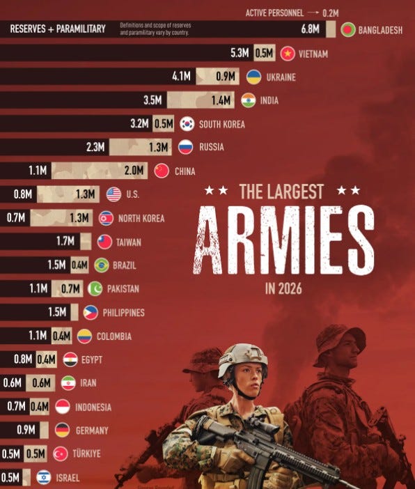 2026 verilerine göre toplam asker sayısında Bangladesh ilk sırada yer alırken, bu üstünlük büyük ölçüde rezerv ve paramiliter güçlerden kaynaklanıyor. Vietnam ve Ukraine da geniş rezerv yapılarıyla üst sıralarda bulunuyor. Sadece aktif asker sayısında ise yaklaşık 2 milyon personelle China lider konumda. India, Russia ve United States da güçlü aktif ordularıyla öne çıkıyor.