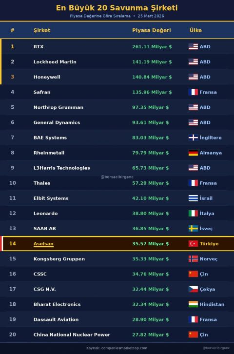 ASELSAN, piyasa değerine göre dünyanın en büyük halka açık savunma şirketleri arasında 14. sırada yer aldı. 25 Mart 2026 verilerine göre hazırlanan küresel sıralamada ASELSAN’ın piyasa değeri yaklaşık 35.57 milyar dolar seviyesine ulaşarak şirketi dünyanın önde gelen savunma firmaları arasına taşıdı. Bu performans, Türkiye savunma sanayiinin finansal ölçekte ulaştığı seviyeyi göstermesi açısından dikkat çekici.