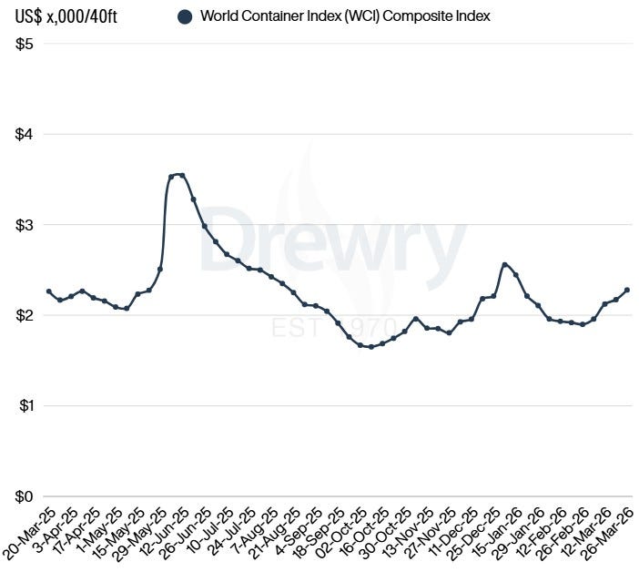 Drewry Dünya Konteyner Endeksi, bu hafta %5 artarak 40’lık konteyner başına 2.279 dolara yükseldi ve üst üste dördüncü haftada da artış gösterdi. Bu yükselişte, özellikle Asya–Avrupa ve Transpasifik hatlarındaki navlun artışları etkili oldu.