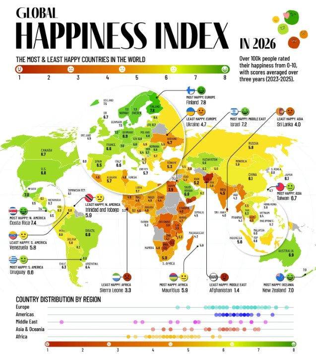 2026 Dünya Mutluluk Raporu’na göre Finlandiya bir kez daha dünyanın en mutlu ülkesi oldu. İskandinav ülkeleri üst sıralardaki yerini korurken, Kosta Rika ve Meksika gibi ülkeler birçok zengin ekonomiyi geride bırakarak öne çıktı.