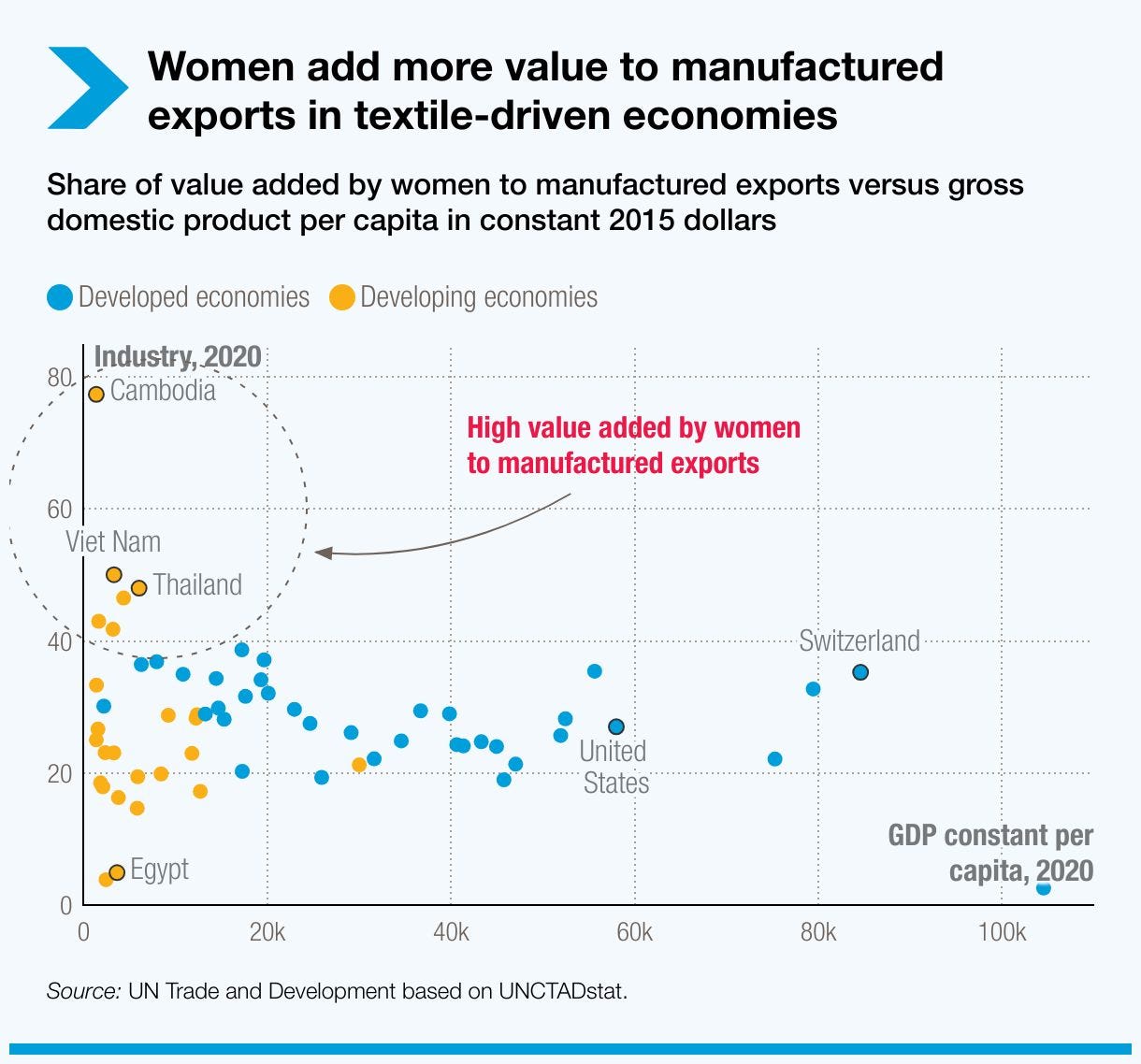 Kadınların sanayi ihracatındaki yerel katma değer payı %20-40 arasında değişirken, Kamboçya’da %77’ye kadar çıkmaktadır. Bu durum, tekstil ve konfeksiyon sektöründe kadın işçilerin belirleyici rolünü ortaya koymaktadır.