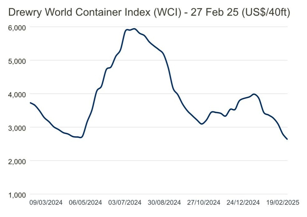 Drewry Dünya Konteyner Endeksi bu hafta %6 düşerek 40ft konteyner başına 2.629 dolara geriledi.