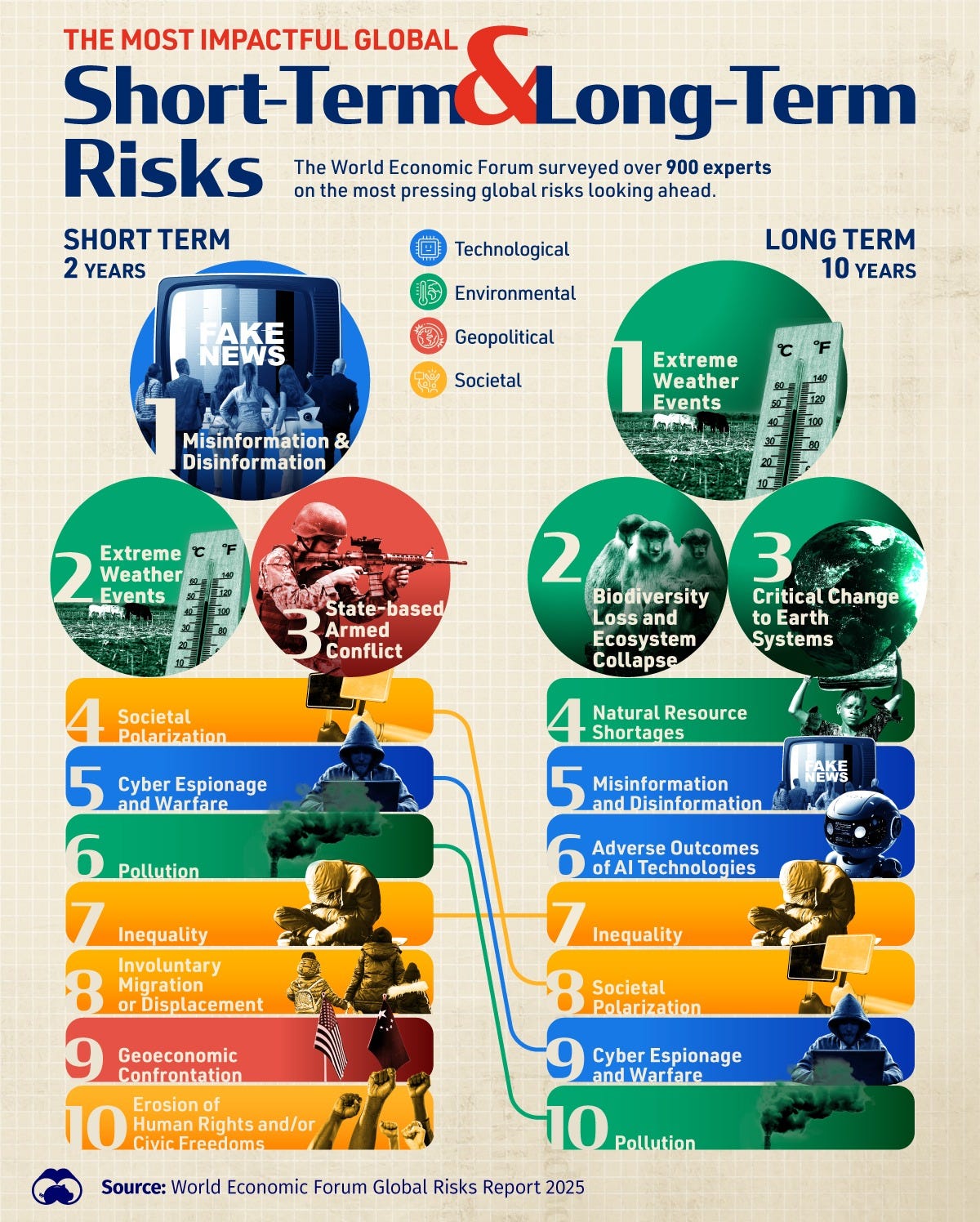 Bu grafik, Dünya Ekonomik Forumu'na göre önümüzdeki 2 ve 10 yıl içinde dünya genelinde en etkili olacak teknolojik, çevresel, jeopolitik ve toplumsal riskleri sıralıyor.