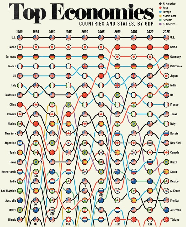 1980–2025 verilerine göre dünya ekonomileri önemli ölçüde değişmiştir. ABD 30,6 trilyon dolar ile birinci sırada yer alırken, Çin 19,4 trilyon dolarla ikinci sıraya yükselmiştir. ABD eyaletleri de büyük ekonomiler seviyesine ulaşmıştır; Kaliforniya 4,3 trilyon dolar ile dünyanın 4. büyük ekonomisi olurken, Teksas ve New York da en büyük 15 ekonomi arasına girmiştir. Türkiye ise 1,6 trilyon dolar ile 20. sıradadır. Genel olarak ekonomik güç Asya’nın yükselişiyle birlikte daha dengeli bir dağılıma yönelmiştir.