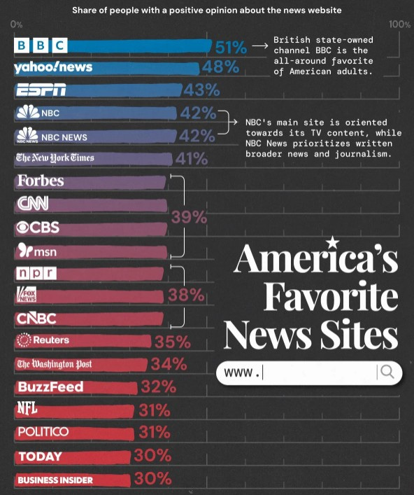 Araştırmaya göre Amerikalıların en olumlu baktığı haber sitesi %51 ile BBC News’tir. Onu %48 ile Yahoo News ve ardından ESPN, NBC ve The New York Times gibi büyük medya kuruluşları takip etmektedir.