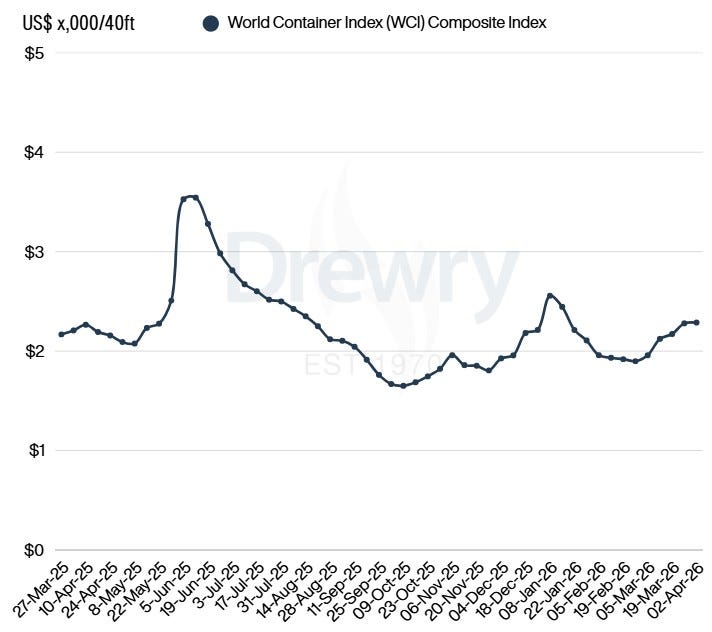Drewry World Container Index bu hafta 40 ft konteyner başına 2.287 dolar seviyesinde sabit kaldı. Genel olarak Asya–Avrupa ve Transpasifik hatlarında navlunlar istikrarlı seyretti.