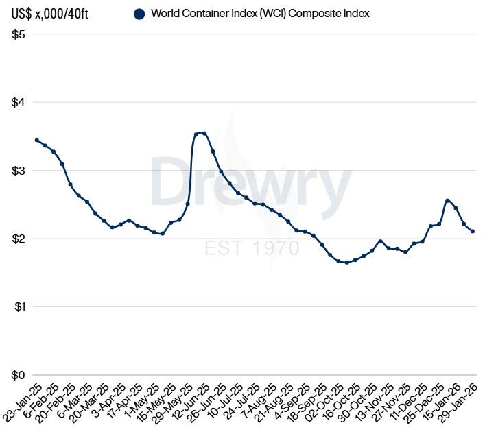 Drewry Dünya Konteyner Endeksi (WCI), Transpasifik ve Asya–Avrupa hatlarındaki navlun düşüşleri nedeniyle üçüncü haftasında da gerileyerek %5 düşüşle 40’lık konteyner başına 2.107 dolara indi.