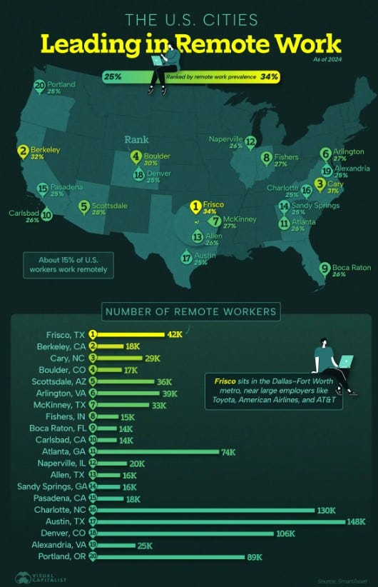 ABD’de uzaktan çalışanların oranı ülke genelinde %15 iken, Frisco (Texas) gibi bazı şehirlerde bu oran %30’un üzerine çıkıyor. Listenin üst sıralarında çoğunlukla gelir seviyesi yüksek banliyöler, teknoloji merkezleri ve üniversite şehirleri yer alıyor. Texas şehirleri ile Berkeley ve Boulder gibi bilgi yoğun ekonomilere sahip kentler, uzaktan çalışmanın hâlâ güçlü biçimde devam ettiği bölgeler olarak öne çıkıyor.