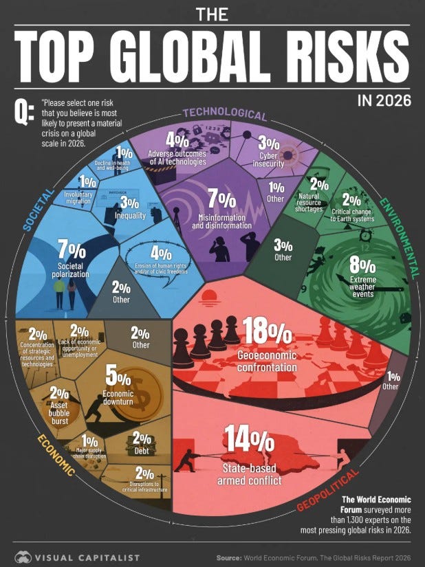 Dünya Ekonomik Forumu’nun 2026 Küresel Riskler Raporu’na göre en büyük küresel risk, %18 ile jeoekonomik çatışmalar. ABD-Çin rekabeti, zayıflayan transatlantik ilişkiler ve süregelen bölgesel gerilimler küresel istikrarı tehdit ediyor. İkinci sırada %14 ile devletler arası silahlı çatışmalar, üçüncü sırada ise %8 ile aşırı hava olayları yer alıyor. Rapora göre bu riskler; ekonomi, iş gücü piyasaları ve toplumsal uyum üzerinde giderek daha ağır etkiler yaratıyor.