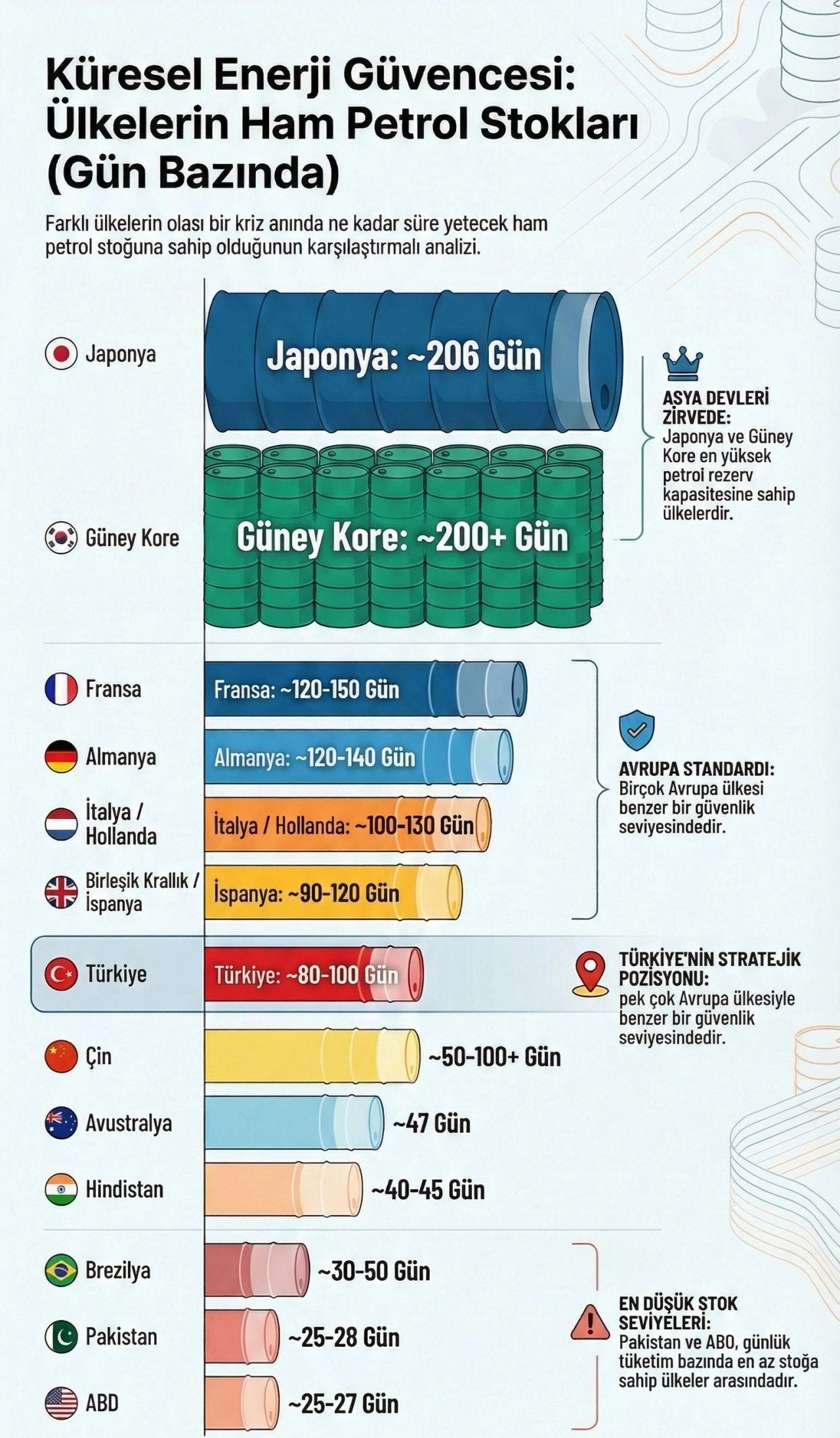 Görsel, ülkelerin olası bir enerji krizinde ham petrol stoklarının kaç gün yeteceğini karşılaştırmalı olarak gösteriyor. Japan ve South Korea yaklaşık 200 günün üzerindeki stoklarıyla en yüksek enerji güvenliği seviyesine sahip ülkeler arasında yer alıyor. Birçok Europe ülkesi ise 90–150 gün aralığında stratejik rezervlere sahip. Turkey yaklaşık 80–100 günlük stok kapasitesiyle Avrupa ortalamasına yakın bir konumda bulunurken, United States ve Pakistan gibi bazı ülkelerde stok gün sayısının daha düşük olduğu görülüyor.