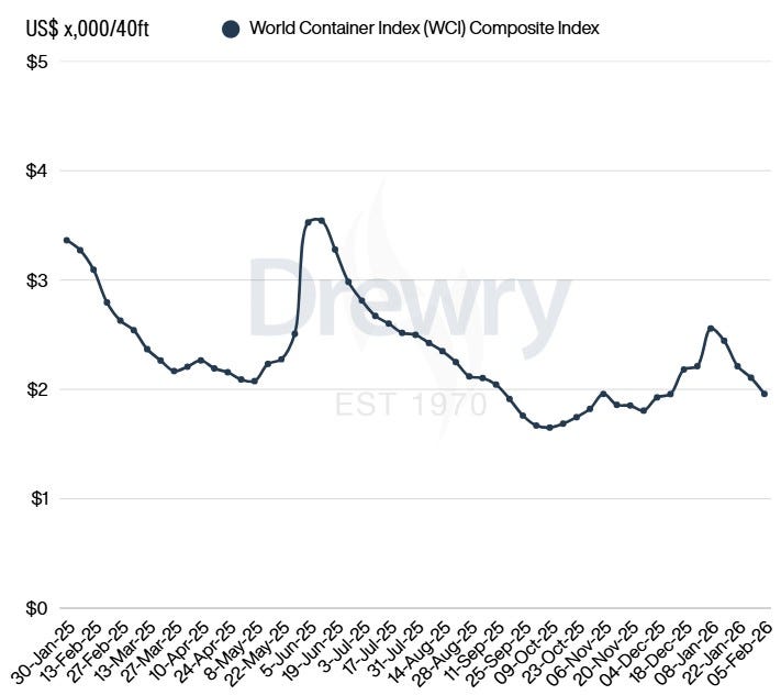 Drewry Dünya Konteyner Endeksi (WCI), 5 Şubat 2026 haftasında %7 düşüşle 40’lık konteyner başına 1.959 dolara geriledi. Böylece endeks üst üste dördüncü haftada düşüş kaydetmiş oldu. Gerilemenin ana nedeni, Transpasifik ve Asya–Avrupa hatlarında spot navlunların zayıflaması olarak öne çıkıyor.
