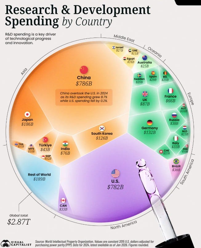 2024’te Çin, 785,9 milyar dolarlık Ar-Ge harcamasıyla ilk kez ABD’yi geride bırakarak küresel lider oldu. Küresel Ar-Ge harcamalarının %45’i Asya kaynaklı gerçekleşirken, Güney Kore ve Hindistan’ın yükselişi Asya’yı inovasyonun yeni merkezi haline getirdi.