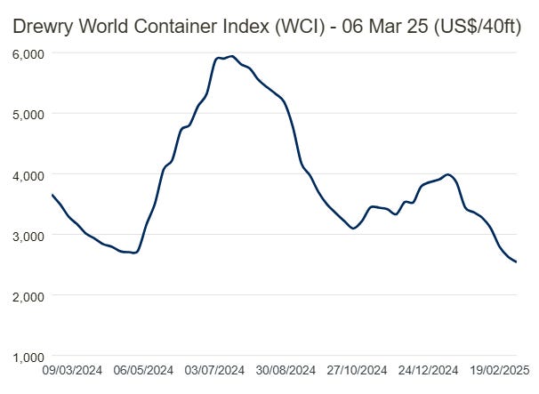 Bu, Eylül 2021'deki 10.377 dolarlık pandemi zirvesinin %76 altında ve Ocak 2024'ten bu yana en düşük seviyede. Ancak endeks, pandemi öncesi 2019'daki ortalama 1.420 dolar seviyesinden %79 daha yüksek.